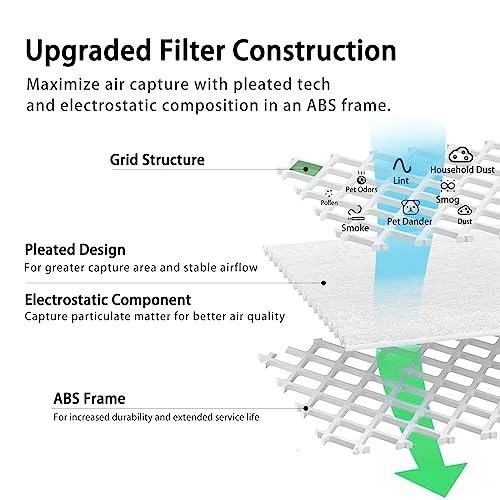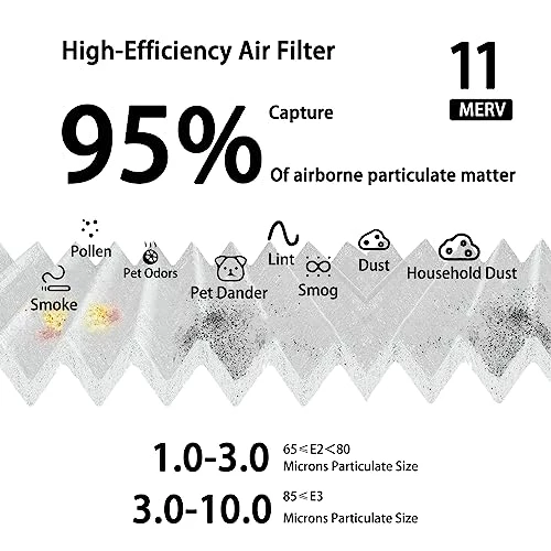 - 3.Air Filter 14x14x1 – Designed with exclusive 3-in-1 technology and MERV 8 rating,Attracts and captures particles such as lint, pollen, dust, pet dander and smog,Helps capture unwanted particles from your household air to contribute to a cleaner,Allowing cleaner air to flow through.