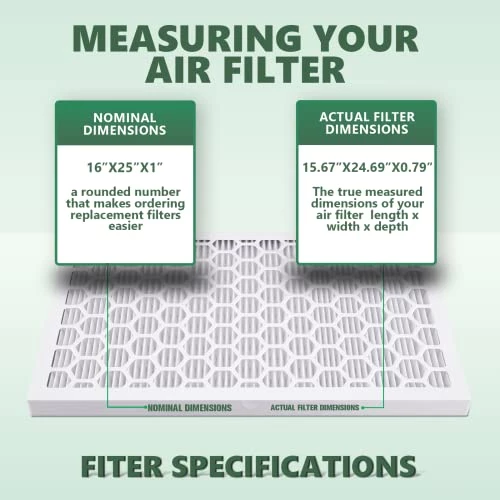 - 【Dimensions】: filter dimensions are 25x16x1, which makes ordering replacement filters much easier. The actual dimensions of the filter are 15.67×24.69×0.79 (length x width x depth). Please double-check before purchasing to ensure compatibility with your air filtration system.
